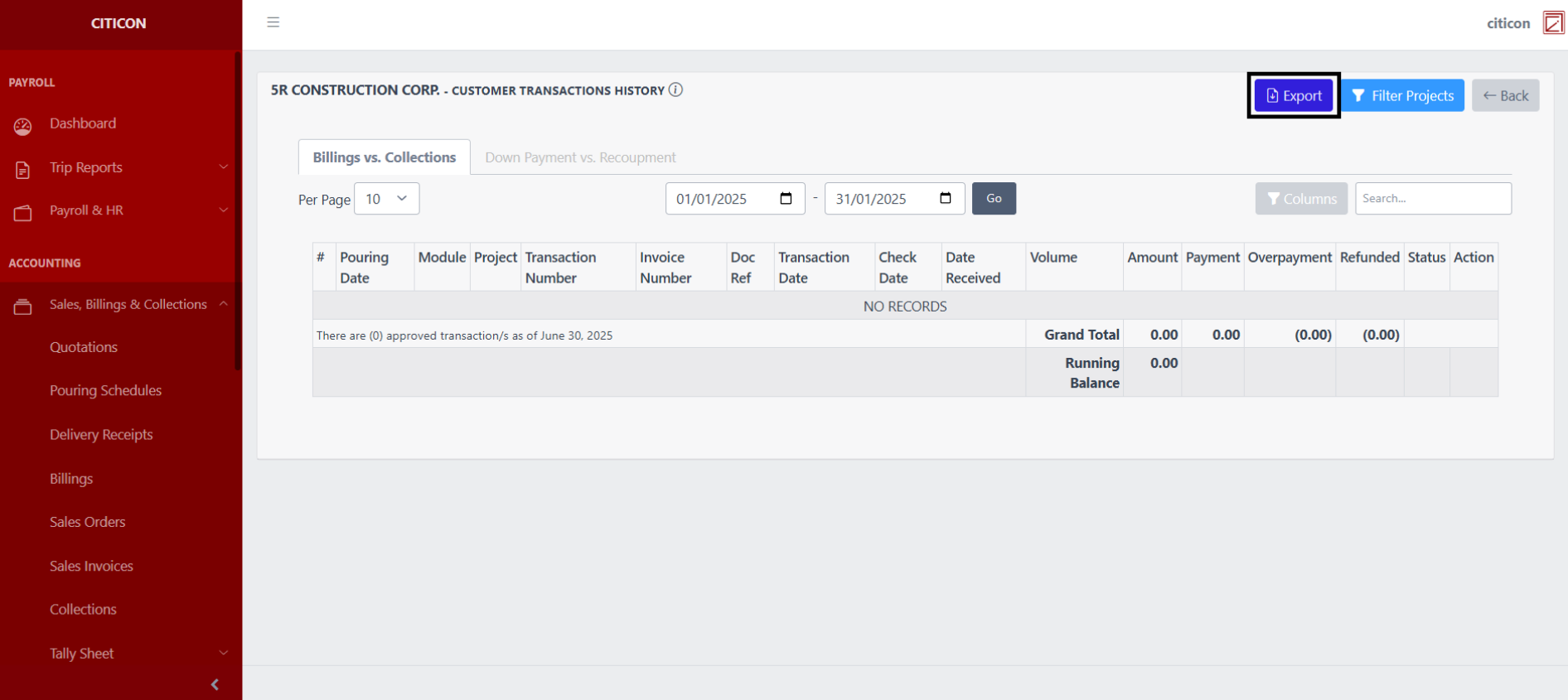 - Select if you want to show entries on 'Billings vs. Collections', or 'Down Payment vs. Recoupment'.