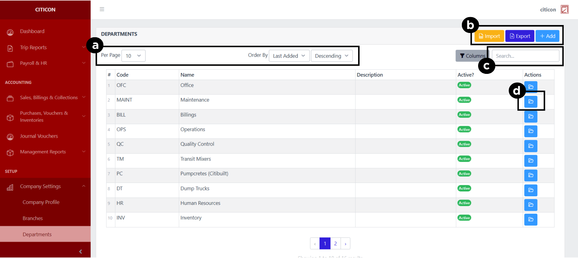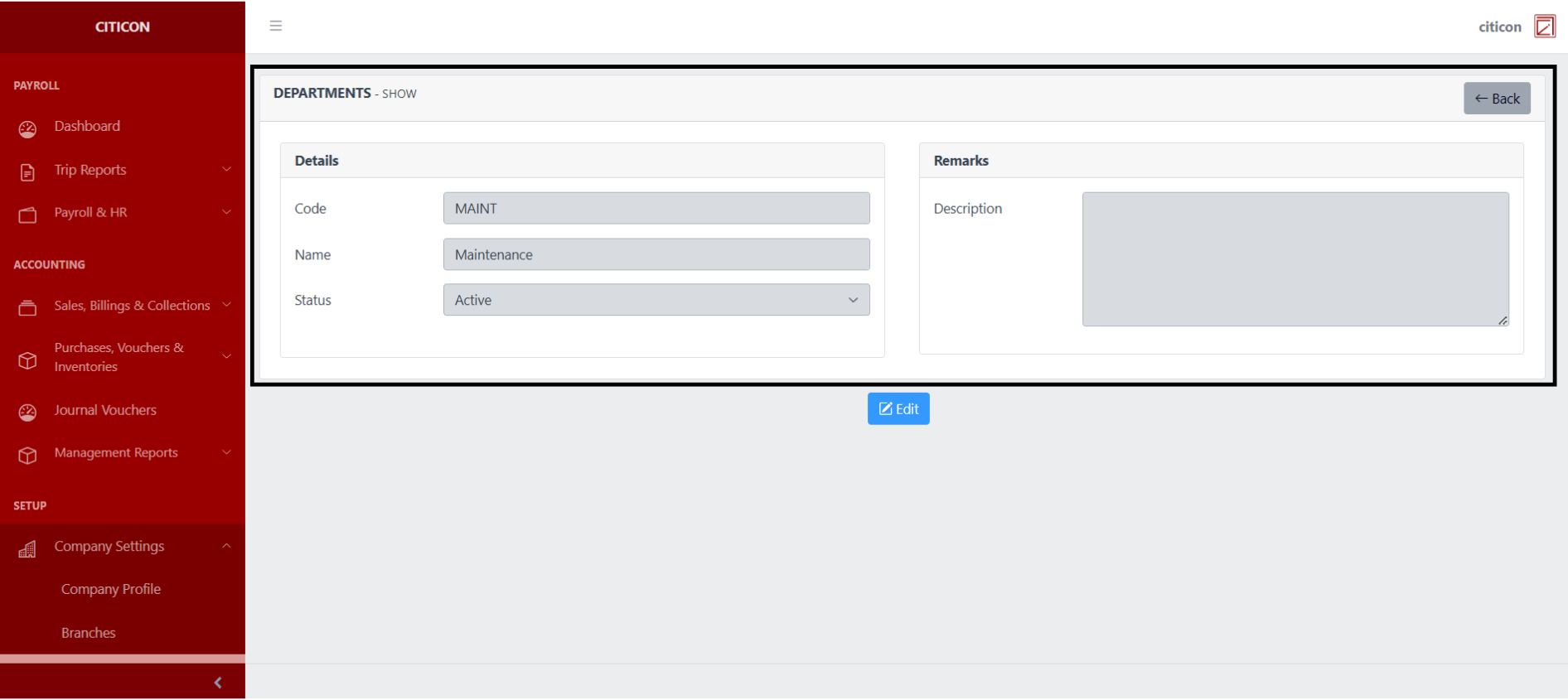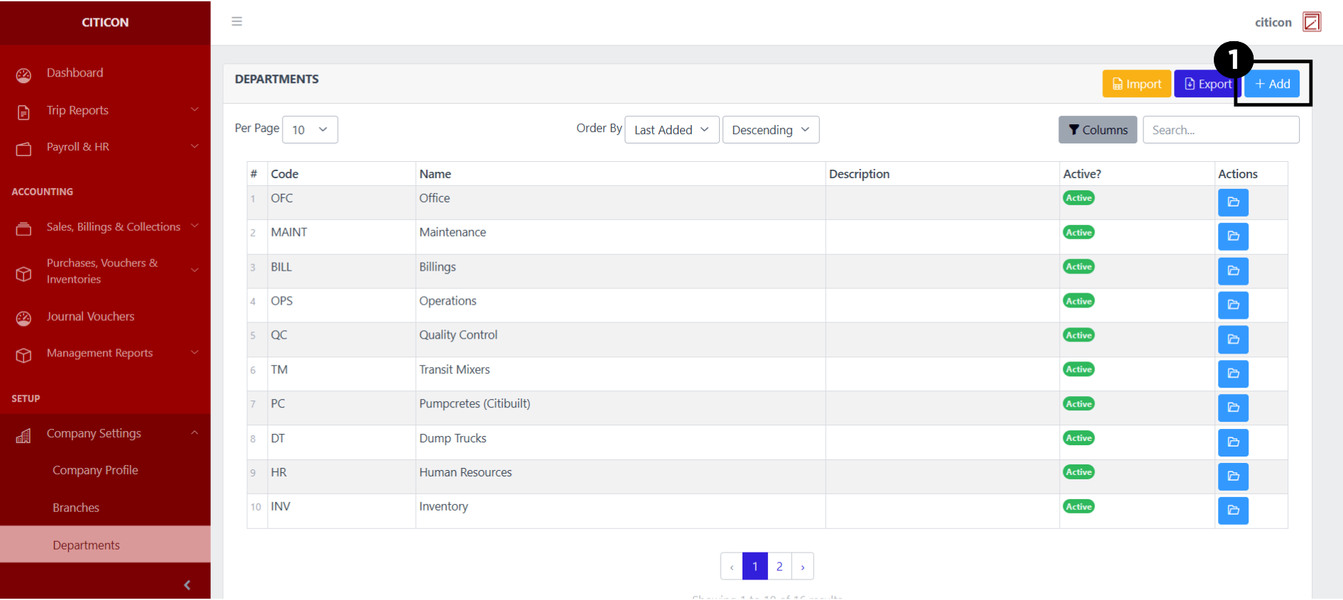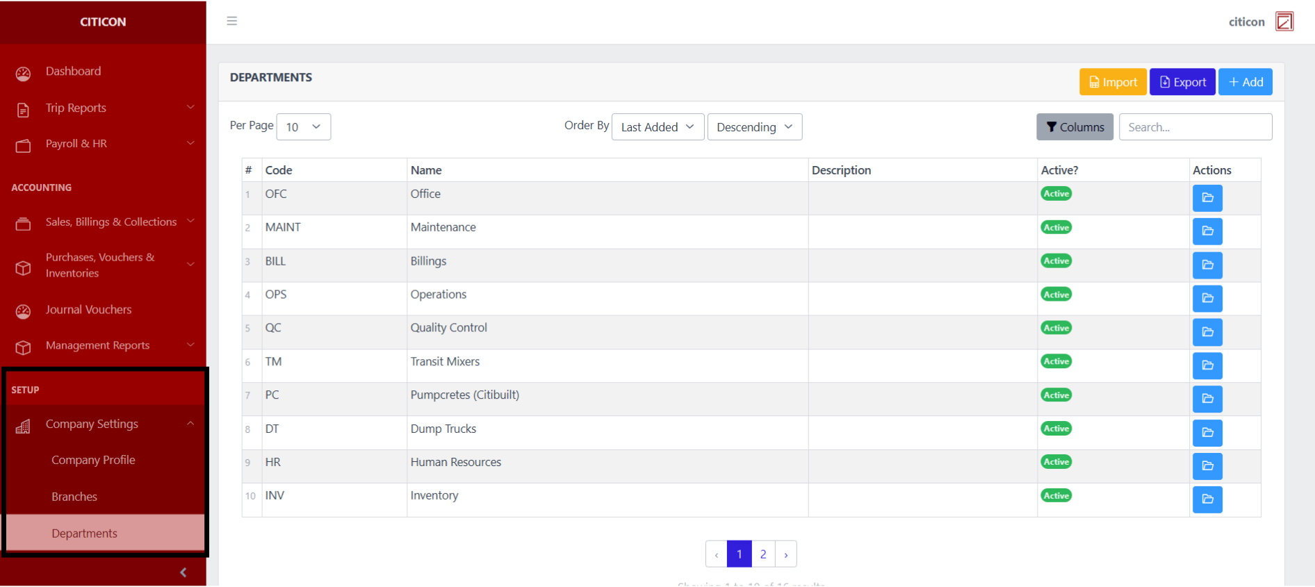 Welcome to Citicon Payroll and Accounting Systems Configuration for Departments. This section is dedicated to organizing your company’s internal structure by managing various departments across the organization.