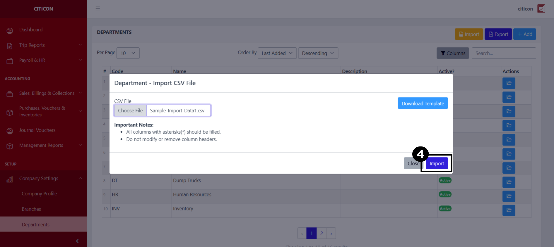 Select the Download Template button to view the required format for imported data, including the number of columns, and mandatory fields to be filled.