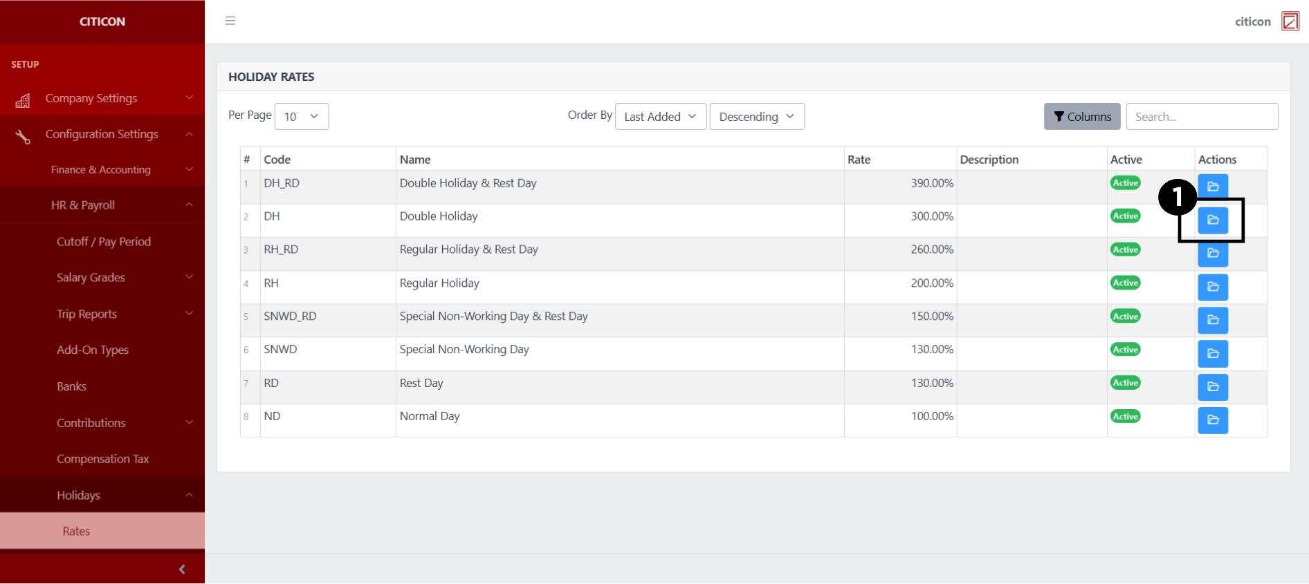 Welcome to Citicon Payroll and Accounting Systems Configuration for Holiday Rates. This section allows you to manage and set up various holiday pay rates that apply to your workforce. Accurate configuration ensures that employees are compensated appropriately during special and regular holidays based on company policy and government mandates.