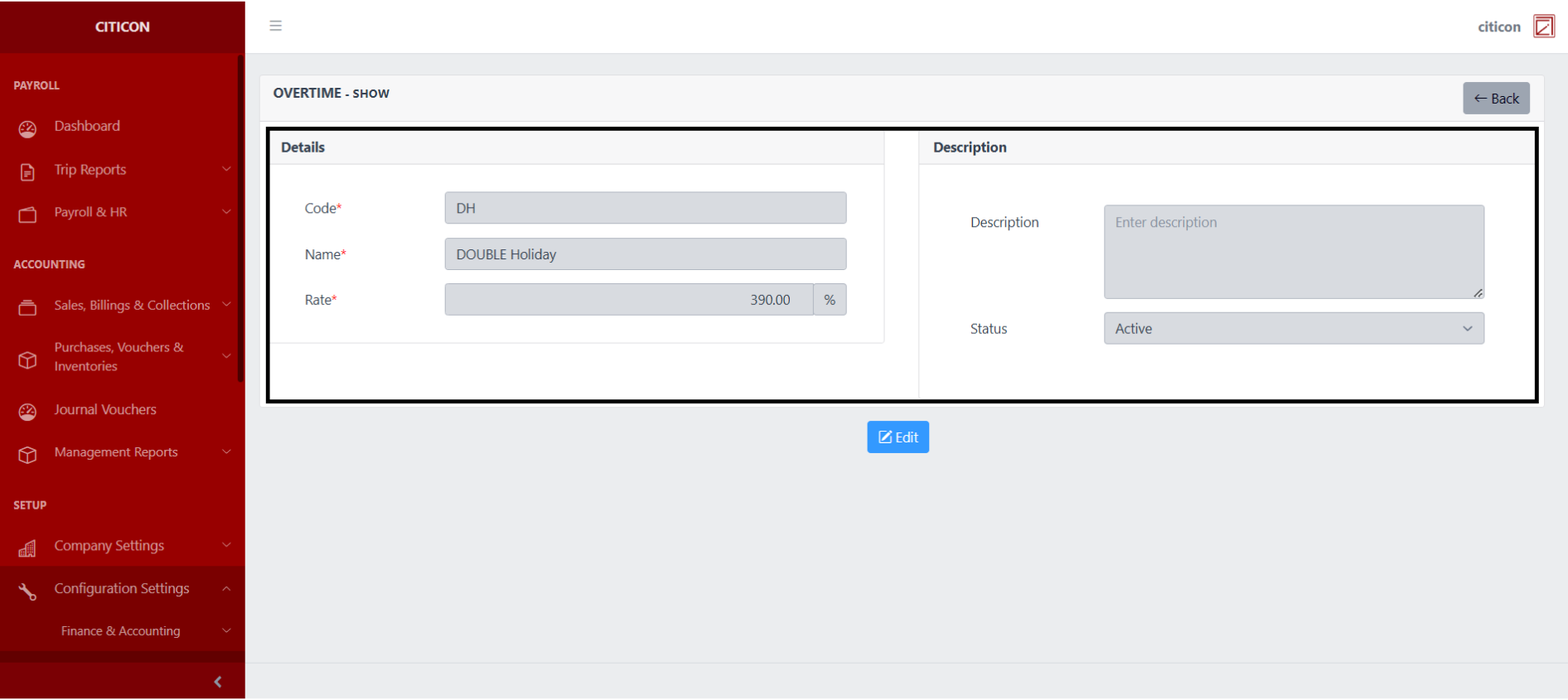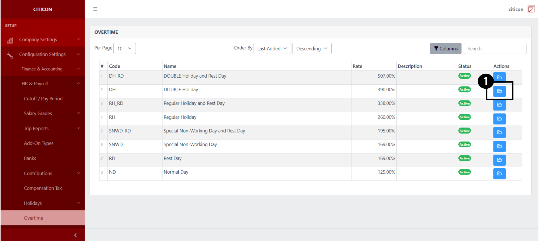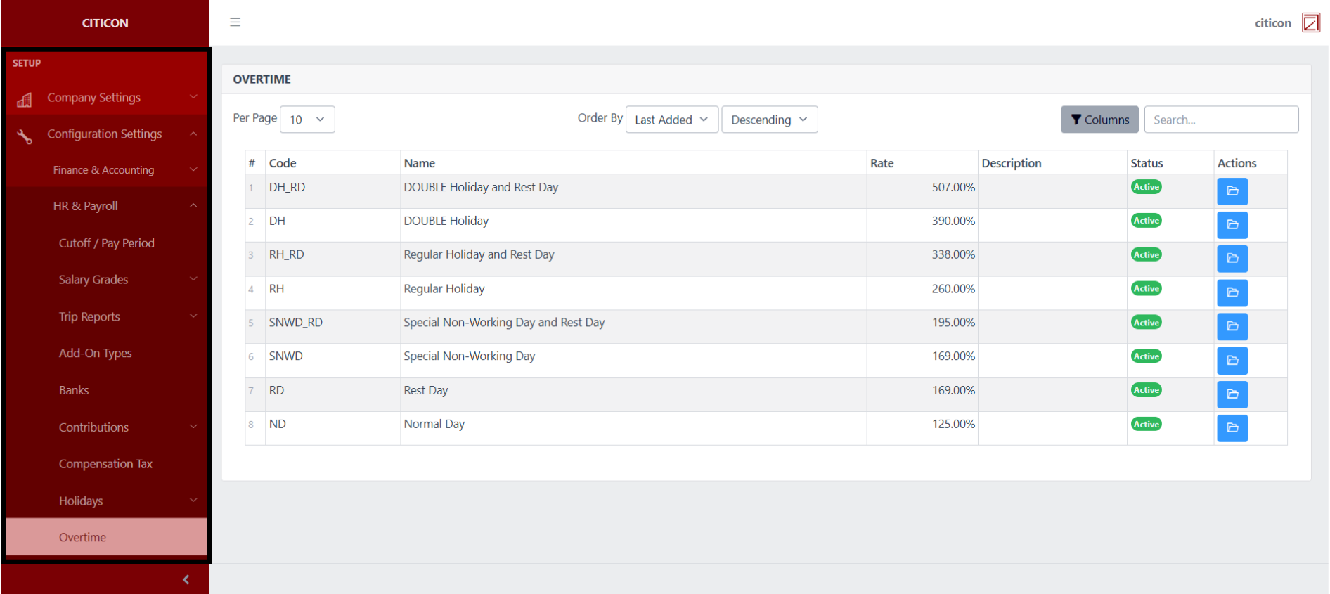 Welcome to Citicon Payroll and Accounting Systems Configuration for Overtime. This section enables you to define and manage overtime compensation rates used across your organization, ensuring fair and accurate payout for hours worked beyond regular schedules.