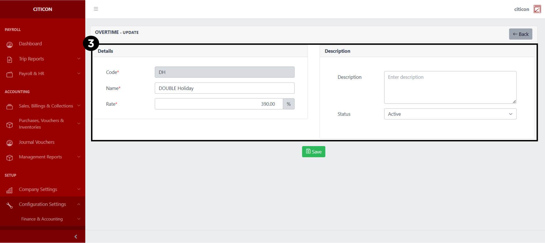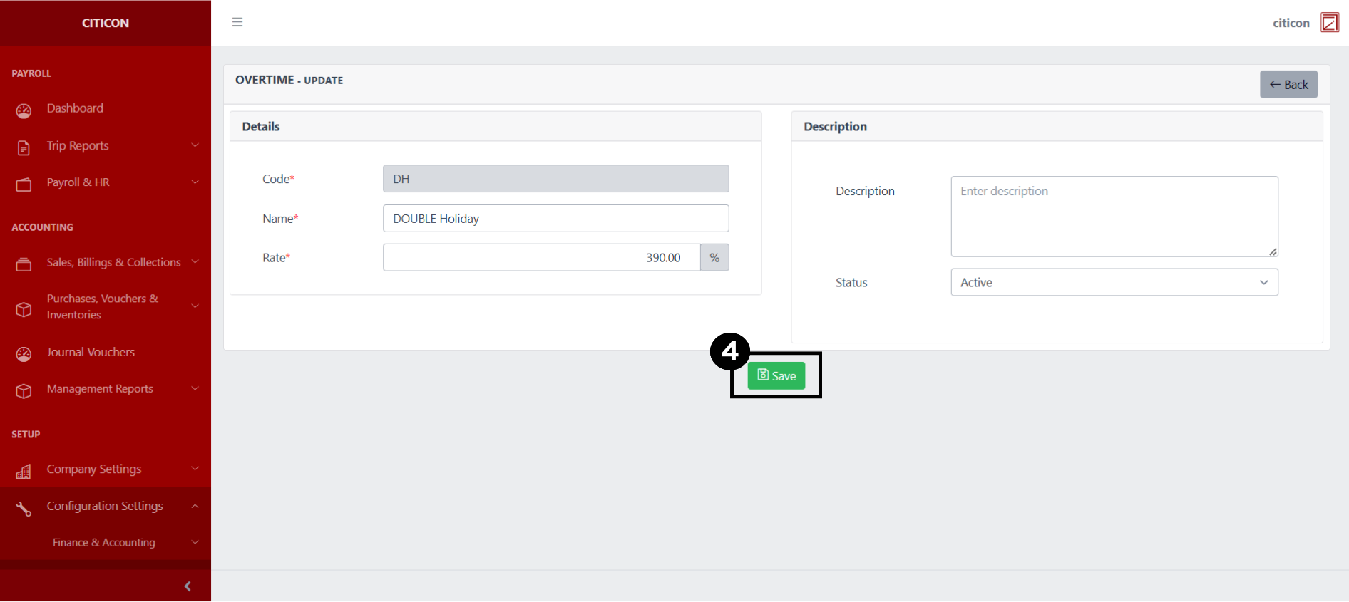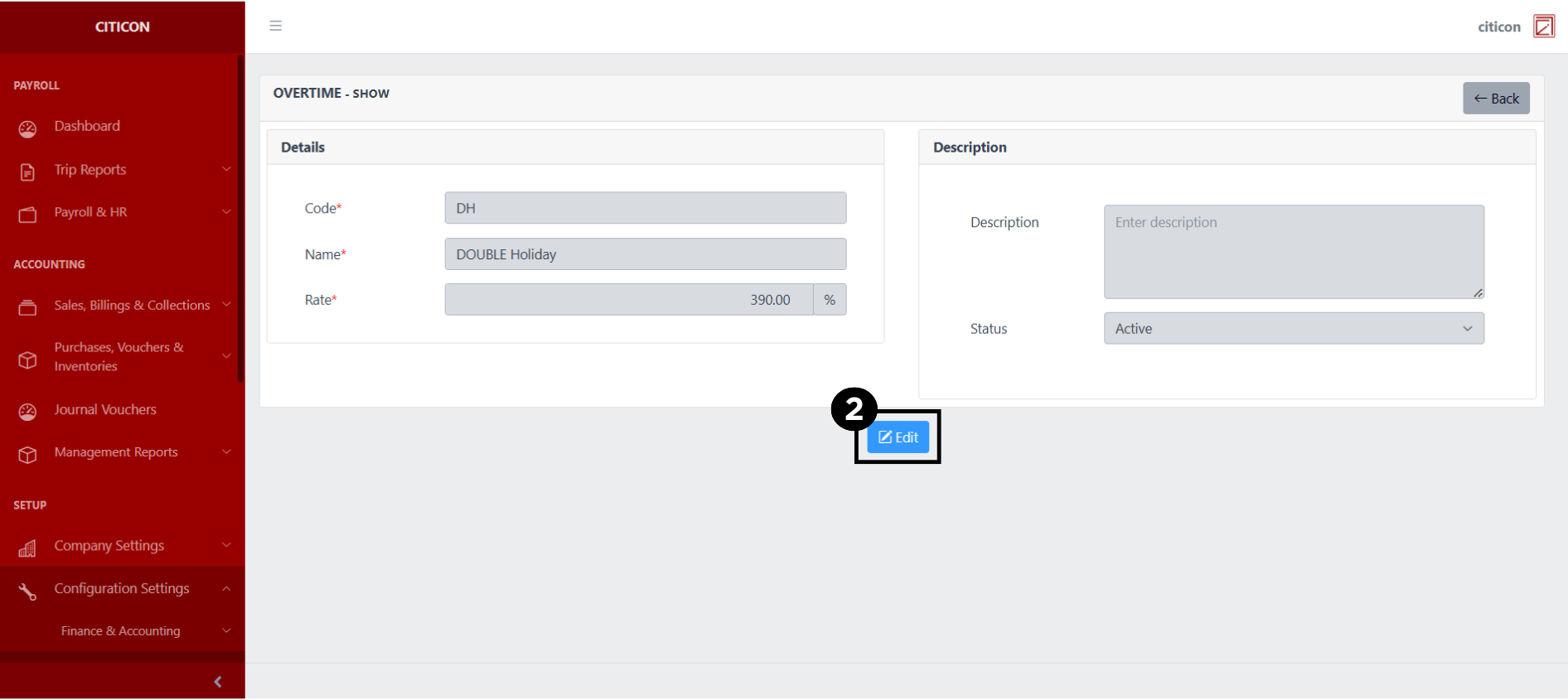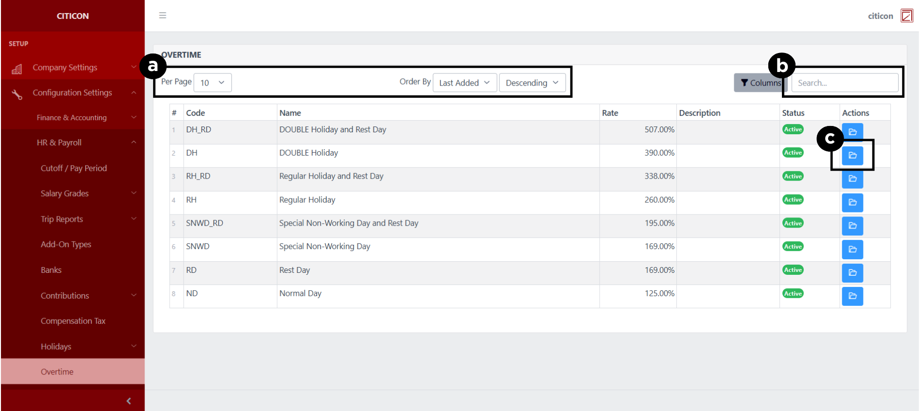 Welcome to Citicon Payroll and Accounting Systems Configuration for Overtime. This section enables you to define and manage overtime compensation rates used across your organization, ensuring fair and accurate payout for hours worked beyond regular schedules.