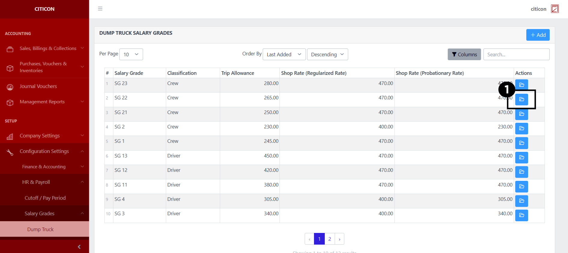Welcome to Citicon Payroll and Accounting Systems Configuration for Salary Grade – Dump Truck. This module is designed to help you define and manage the salary structure and trip-based compensation settings for dump truck drivers and crew, supporting clear classification and accurate payroll calculations.
