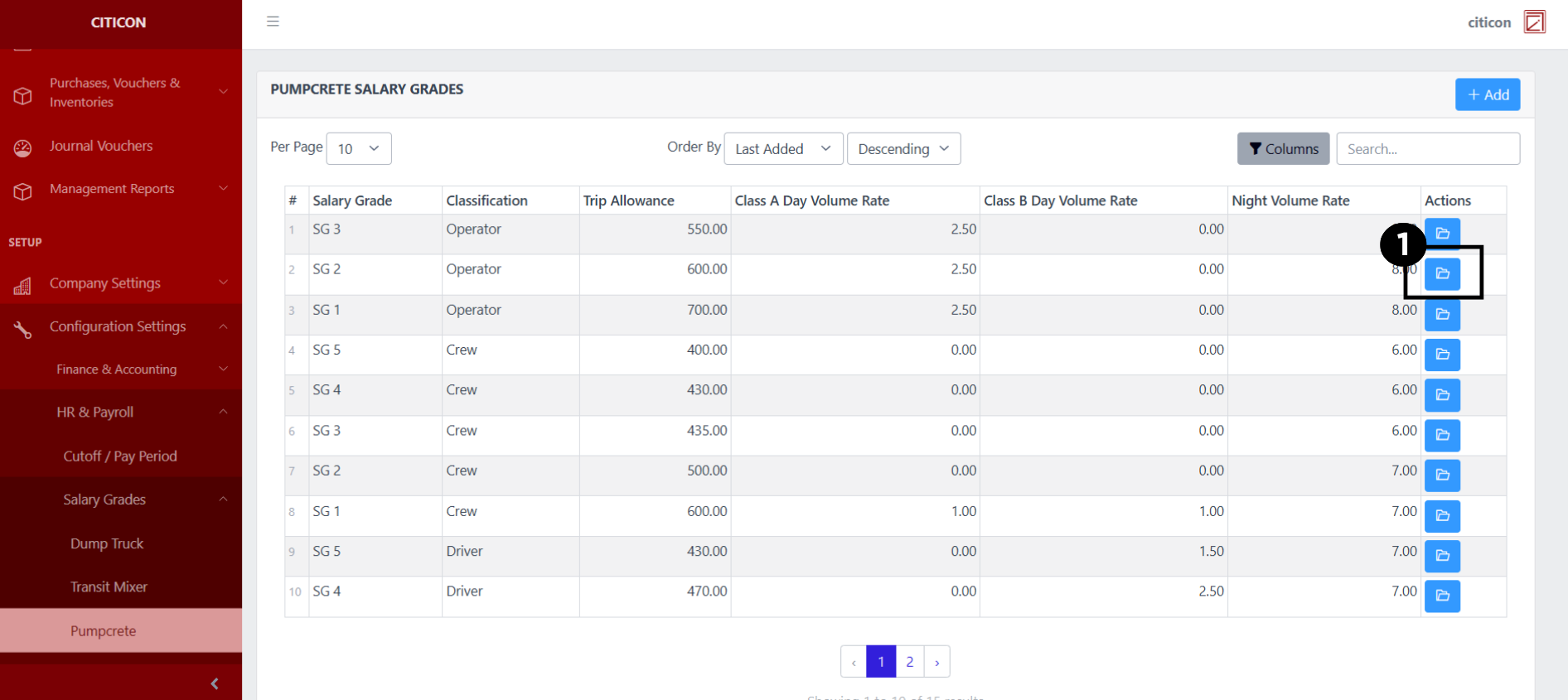 Welcome to Citicon Payroll and Accounting Systems Configuration for Salary Grade – Pumpcrete. This module enables you to manage specialized salary structures and allowances for pumpcrete team members, ensuring accurate payroll distribution based on role classification, day rates, and night volume operations.