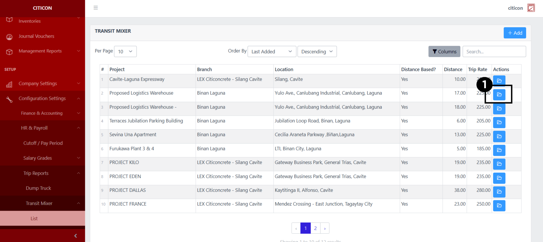Welcome to Citicon Payroll and Accounting Systems Configuration for Trip Reports – Transit Mixer (List). This module allows you to manage and define trip-based payroll components for Transit Mixer operations, ensuring consistency and accuracy based on projects, locations, and travel parameters.