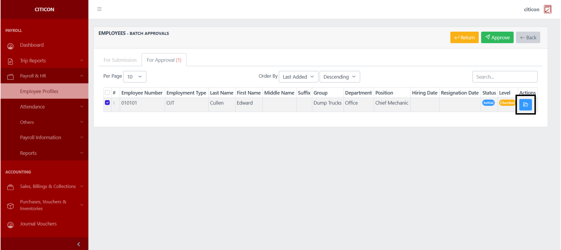 To view the details of an individual entry, select the folder button and from here, you may either Return, Approve, or Cancel the entry.