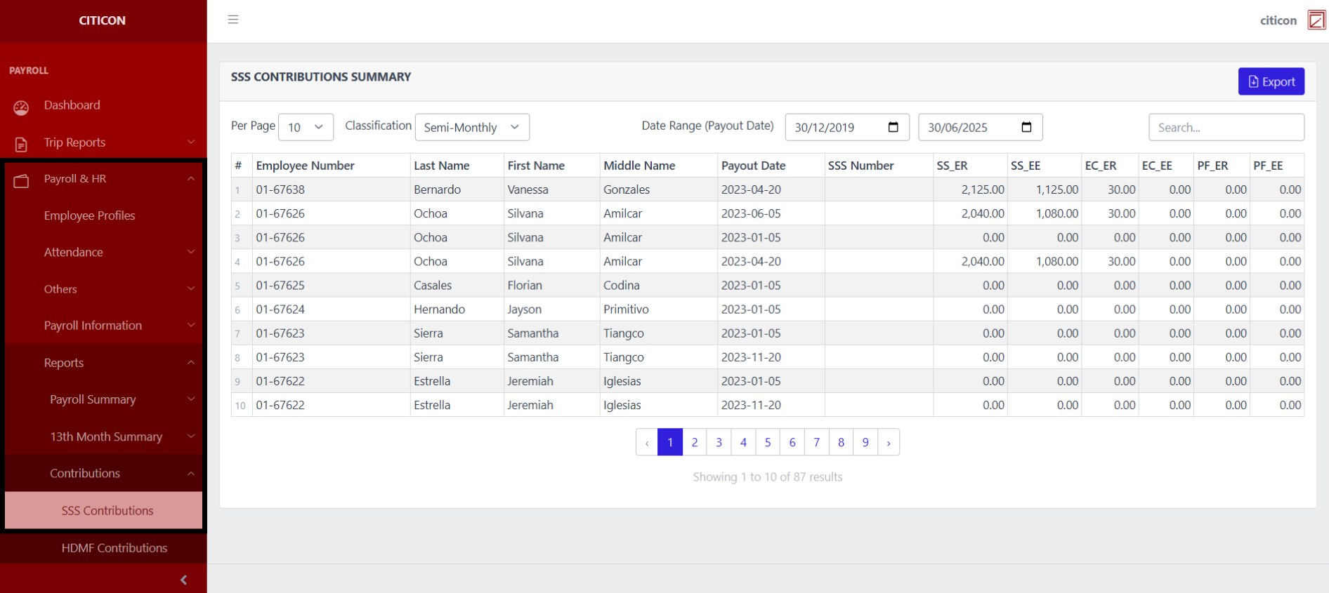 - Centralized Contribution Reporting: View detailed SSS contribution records including employer share (ER), employee share (EE), and provident fund (PF) components.