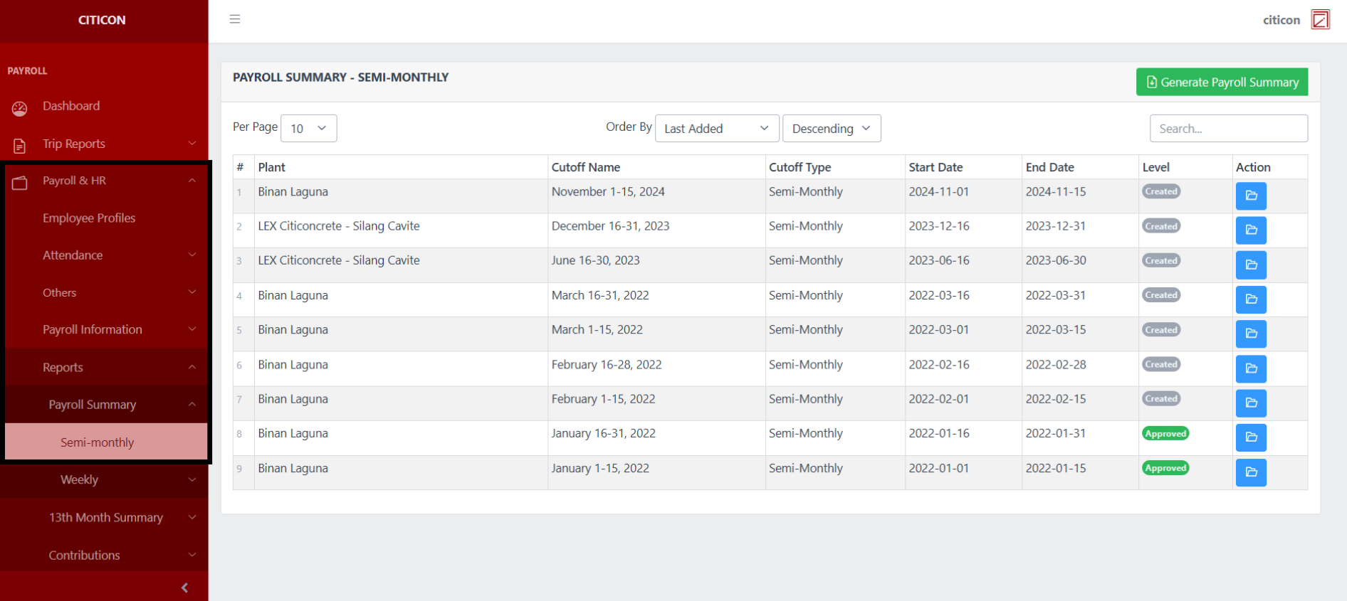 Welcome to Citicon Payroll and Accounting Systems Reports for Payroll Summary – Semi-Monthly. This report module consolidates payroll information for each semi-monthly cutoff, providing HR and Accounting with a structured overview of employee pay, deductions, and contributions.
