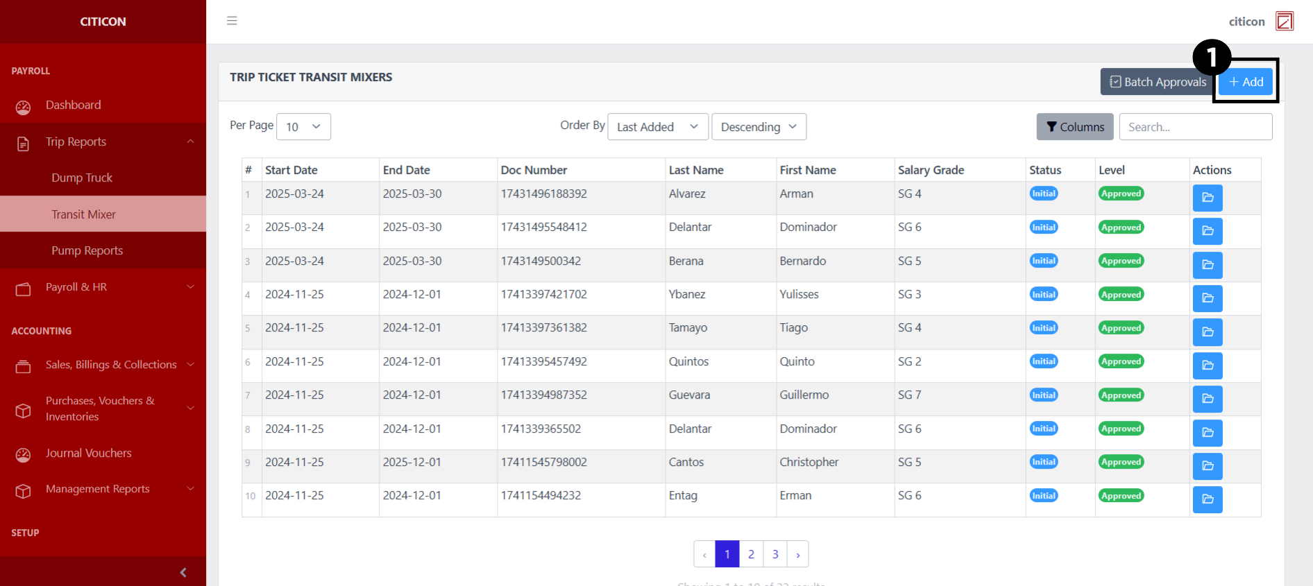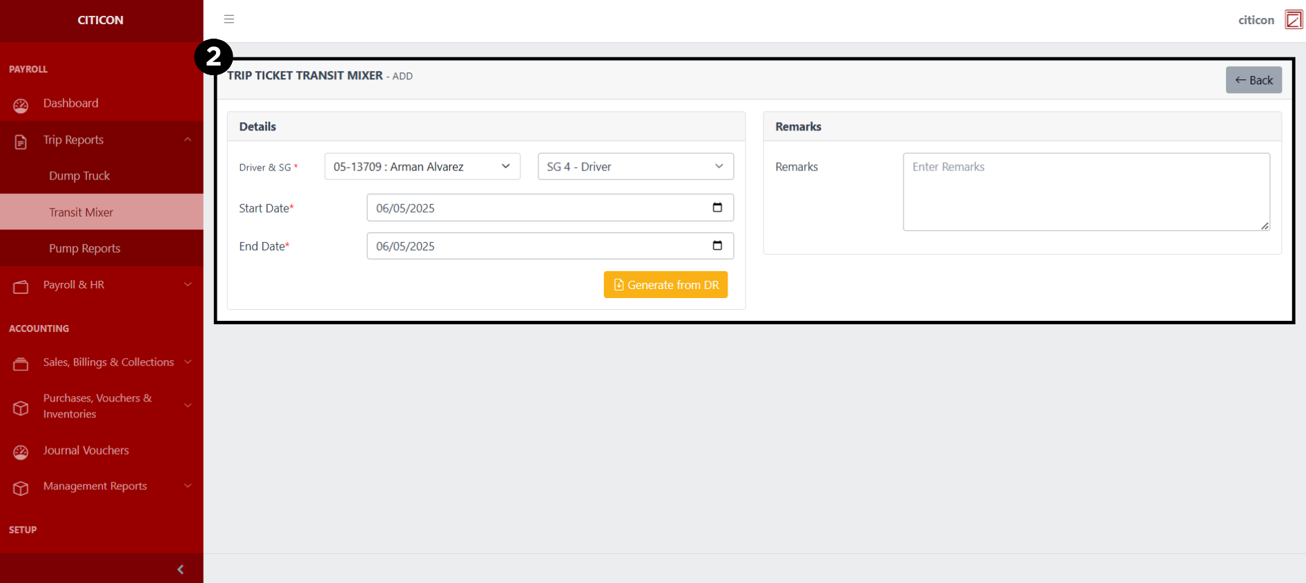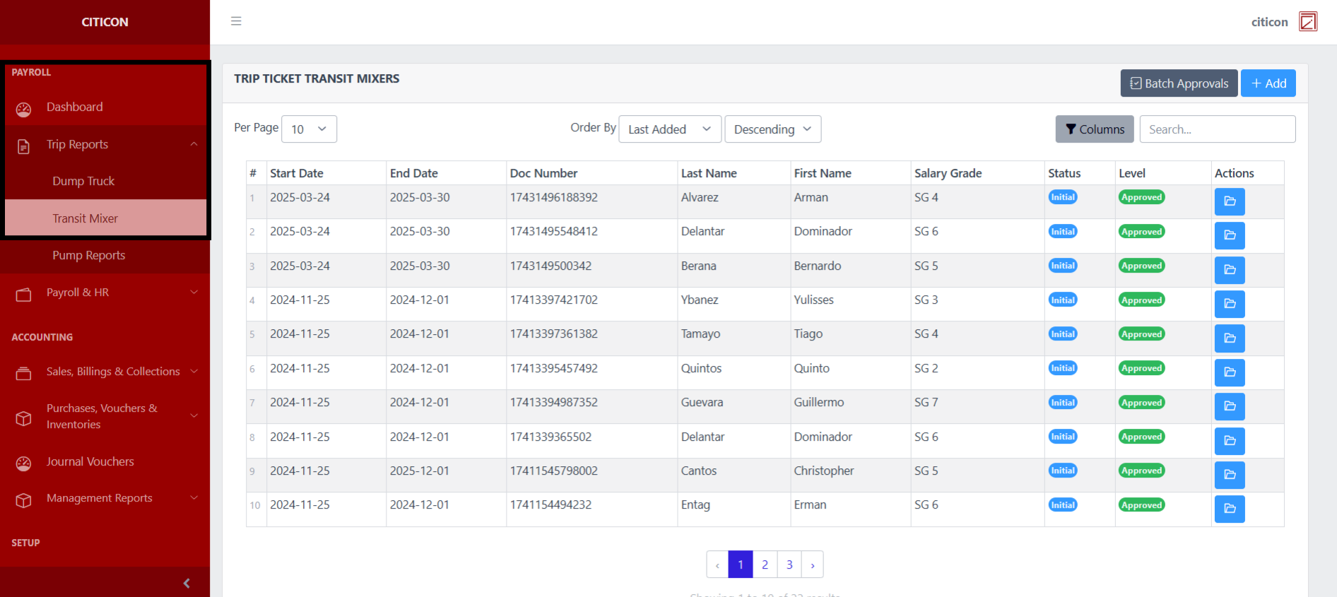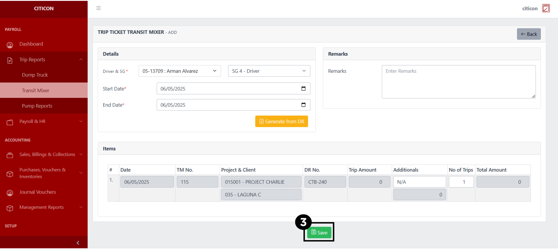 Welcome to Citicon Payroll and Accounting Systems Configuration for Trip Reports - Transit Mixer. This section allows you to log and manage detailed trip data for transit mixer operations, supporting transparent job tracking, compensation calculation, and project-specific reporting. With structured entries for each trip and clear breakdowns of involved resources and costs, this module helps standardize how trip records are submitted, approved, and used in payroll and project analytics.