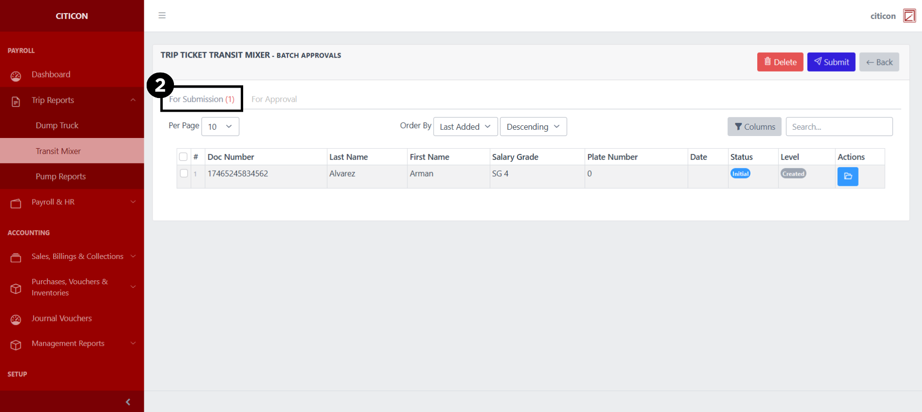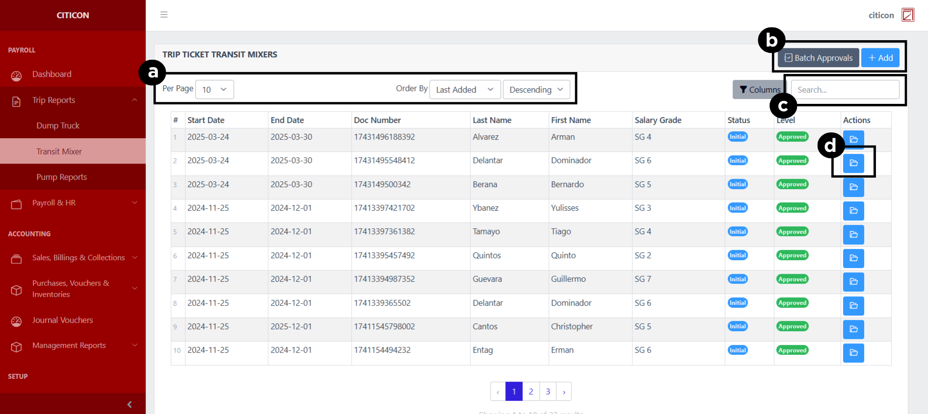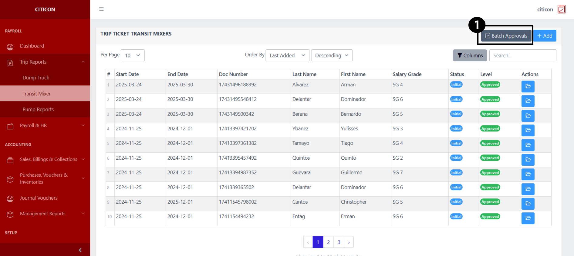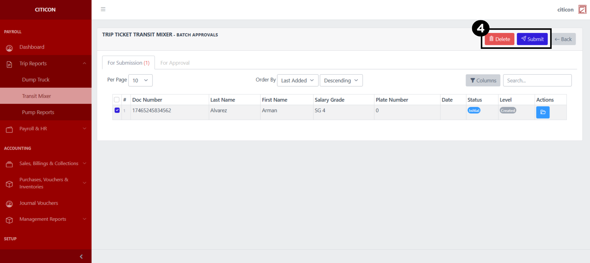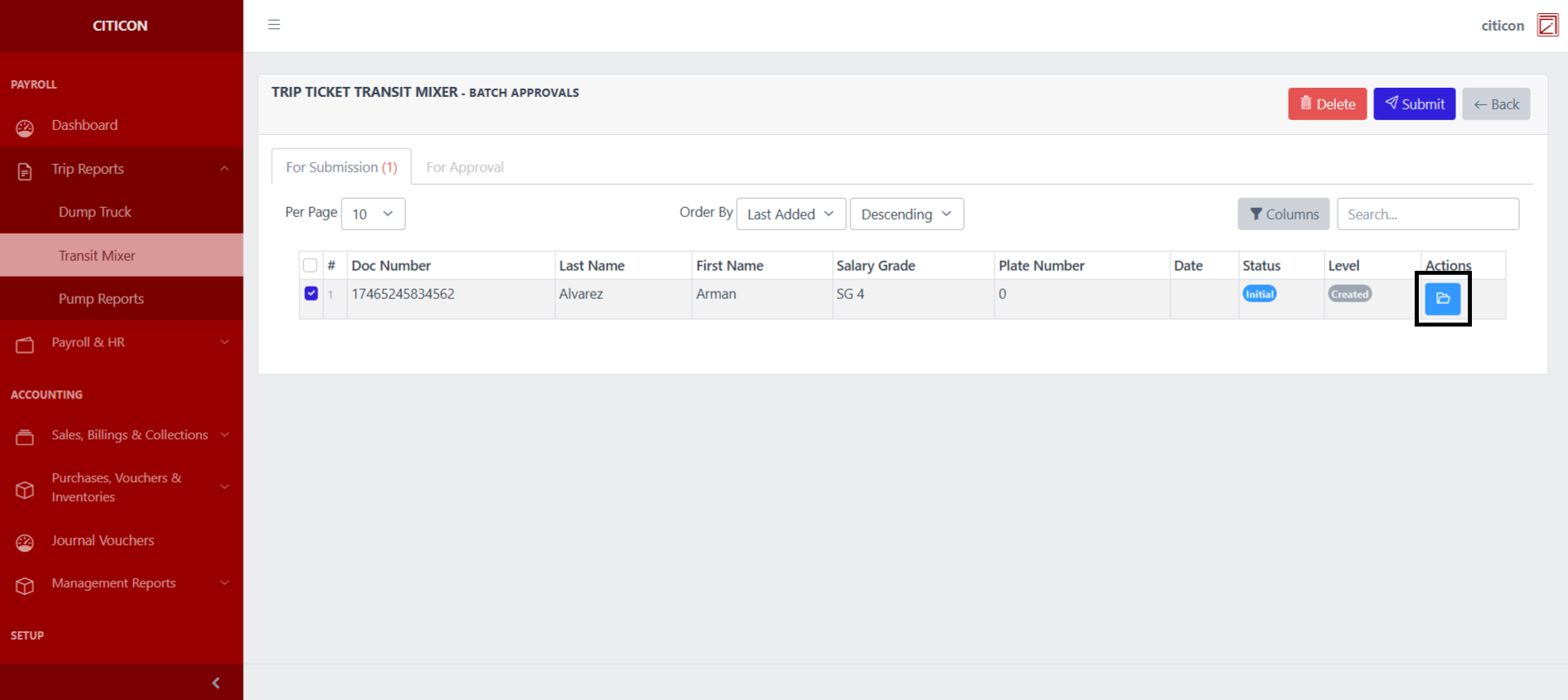 Welcome to Citicon Payroll and Accounting Systems Configuration for Trip Reports - Transit Mixer. This section allows you to log and manage detailed trip data for transit mixer operations, supporting transparent job tracking, compensation calculation, and project-specific reporting. With structured entries for each trip and clear breakdowns of involved resources and costs, this module helps standardize how trip records are submitted, approved, and used in payroll and project analytics.